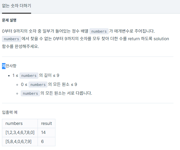 0부터 9까지 배열의 총 합인 45에서 주어진 배열의 합을 빼버리면 되겠다! 는 생각은 금방 했는데, 모든 조건이 랜덤하게 주어진 배열의합을 어떻게 찾을지를 쓸데없이 오래 고민했다 그냥 0부터 계속 더해버리면 되는데... 앞에서 등차수열 한번 하고 왔다고...ㅋㅋㅋㅋㅋㅋㅋ reduce()를 이용해 한 줄로 줄인 코드가 있었는데 내일 다시 알아보기로...