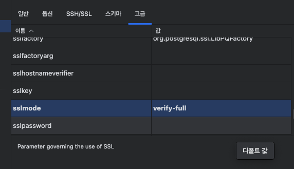 ๋ฐ˜๋Œ€๋กœ ์•„๋ž˜์™€ ๊ฐ™์ด verify-full๋กœ ํ•˜๋Š” ๊ฒฝ์šฐ ์„ฑ๊ณต์ ์œผ๋กœ ์—ฐ๊ฒฐ์ด ๋˜๋Š” ๊ฒƒ์„ ํ™•์ธ ํ•  ์ˆ˜ ์žˆ์Šต๋‹ˆ๋‹ค.(jetbrains data grip ์‚ฌ์šฉ์˜ˆ์‹œ)