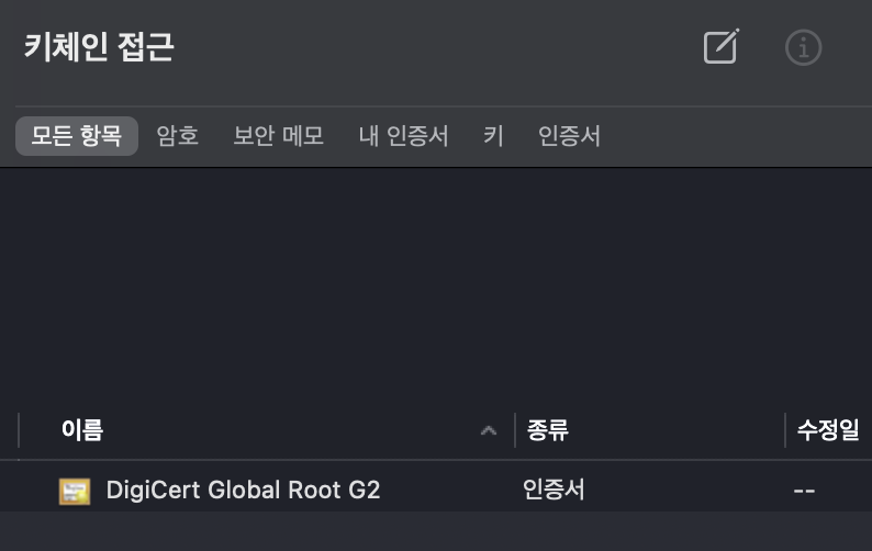 ์‹ค์ œ ์ €์˜ ์ปดํ“จํ„ฐ์˜ ํ‚ค์ฒด์ธ์—์„œ ๊ฒ€์ƒ‰์„ ํ•˜๋ฉด ์•„๋ž˜์™€ ๊ฐ™์ด Root CA๊ฐ€ ๋‚˜์˜ค๋Š” ๊ฒƒ์„ ํ™•์ธ ํ•  ์ˆ˜ ์žˆ์Šต๋‹ˆ๋‹ค.(Macos ๊ธฐ์ค€)