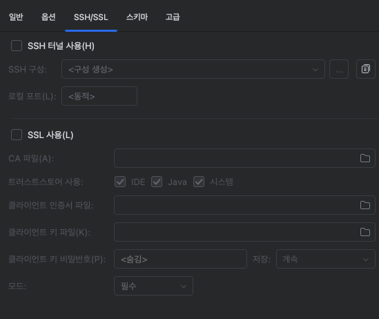 SSL ์‚ฌ์šฉ์˜ˆ์‹œ์—์„œ ํด๋ผ์ด์–ธํŠธ ์ธก ์ธ์ฆ์„œ ํŒŒ์ผ์„ ์„ค์ •ํ•˜๋Š” ์นธ์ด ์žˆ๋Š”๋ฐ ์ด ์˜ต์…˜๋“ค์€ mTLS๋ฅผ ์œ„ํ•œ ์˜ต์…˜์œผ๋กœ ๋‚ด์šฉ์€ ์•„๋ž˜์™€ ๊ฐ™์Šต๋‹ˆ๋‹ค.