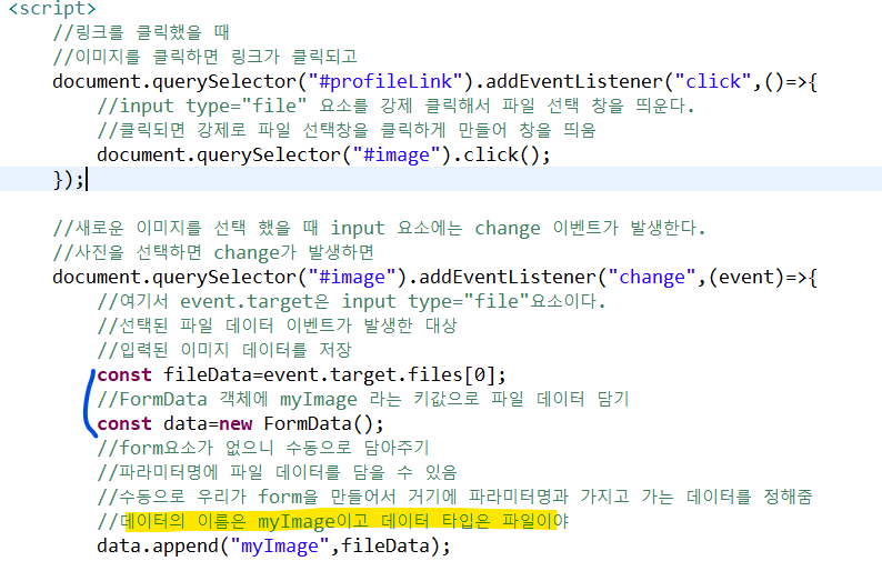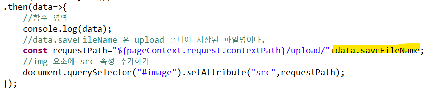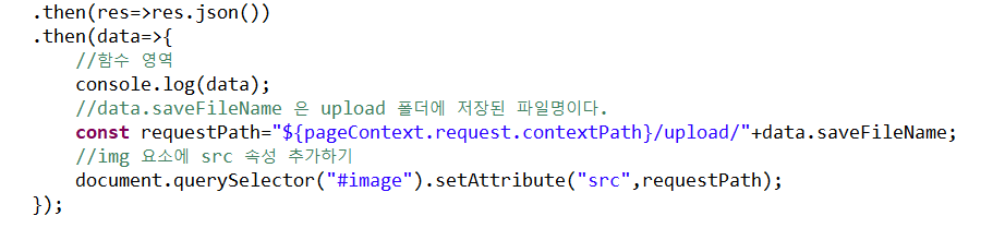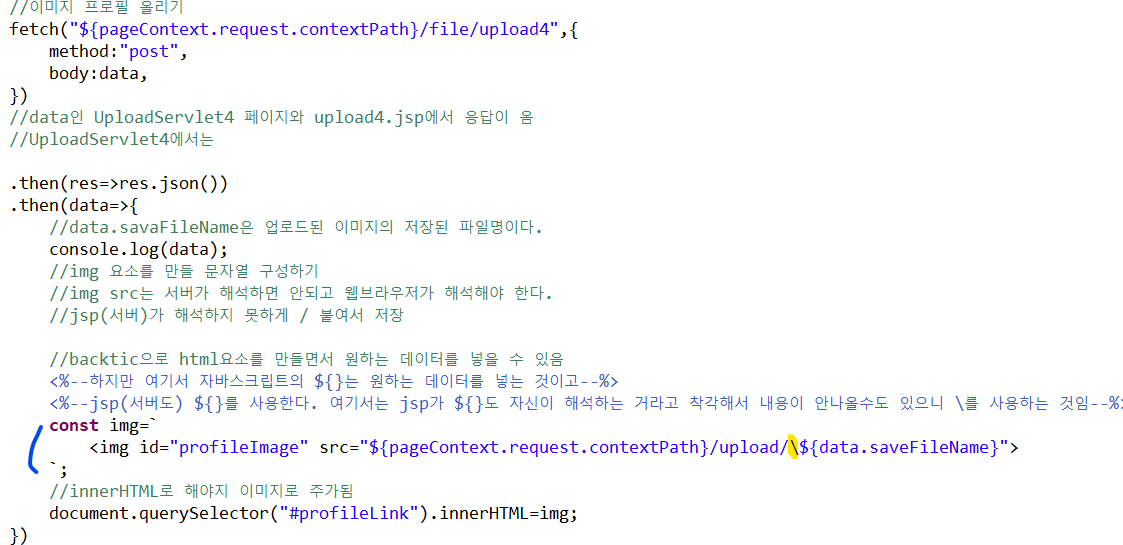 내가 파일을 업로드하면 submit 이 되고 기본 페이지 이동이 막아짐 -> fetch 함수로 servlet에서 복잡한 작업을 한다 = 원본 파일명, 저장될 파일명, 저장될 경로 를 설정하고 지정한 경로에 저장 -> jsp 페이지로 응답 -> 웹브라우저에서 내가 원하는 데이터만 뽑아서 html 구성
