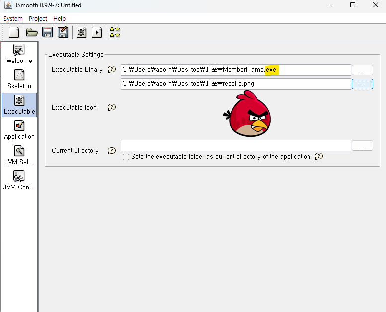 Jsmooth는 gui도 사용 가능하며 아이콘 등도 지정할 수 있다. 하지만 기본 jar파일을 토대로 만들어지기에 jar 파일이 하나 존재해야 한다.