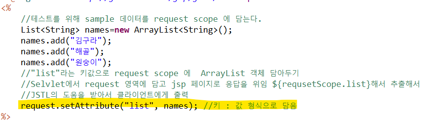 서버에서 request.setAttribute("list", list);로 requestScope(그릇)에 담기 ->