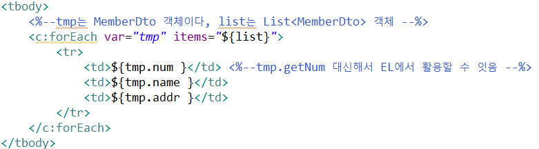 JSTL(<c: forEach>)로 틀 잡고 EL(${})로 데이터 불러오기