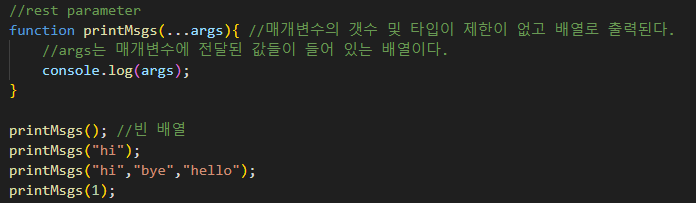 - 매개변수의 갯수 및 타입에 제한이 없이 배열로 출력