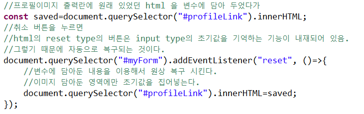 - 폼의 요소인 리셋 버튼은 input type의 초기값을 자동으로 기억함.