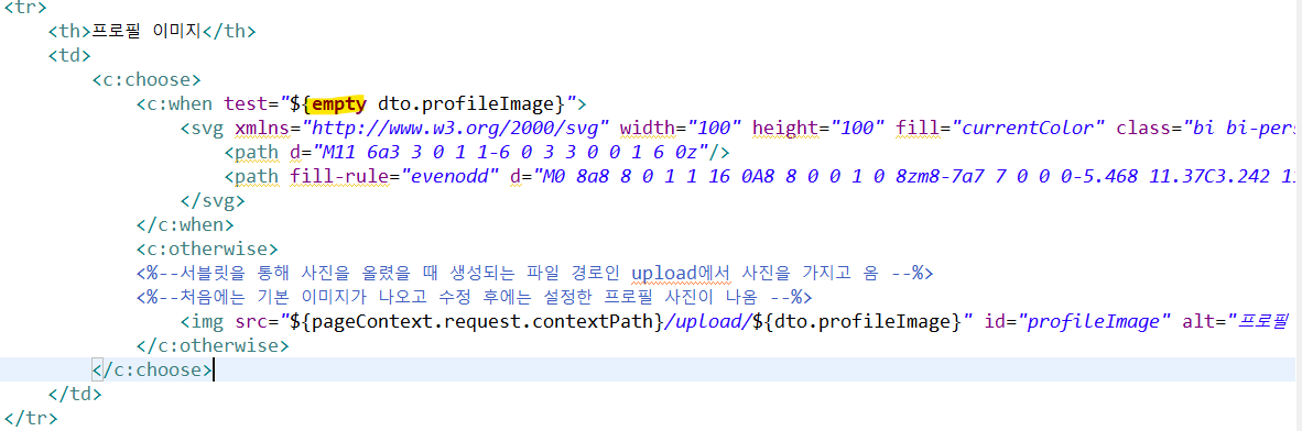 전체흐름 : 만약에 올린 이미지가 없다면 기본 이미지 , 만약에 올린 이미지가 있다면 servlet에서 만든 upload 파일에서 이미지 가져오기