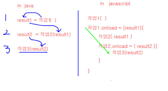 왜냐면 javascript는 비동기 작업이이게 수행하는 동안 다음 작업 ㄱㄱ