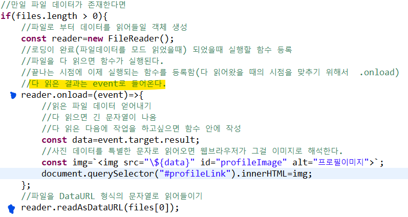 - reader.onload =(evetn)=>{}; : reader 라는 object에 onload라는 방에 함수를 저장하고 함수 수행 경과를 event에 담는다.