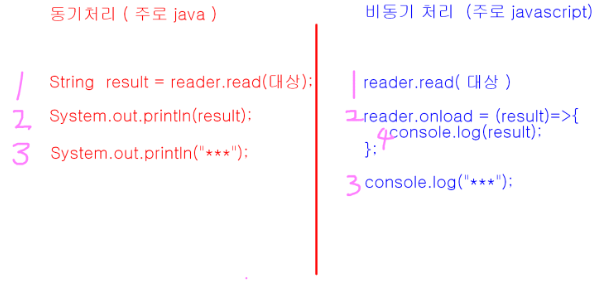 - 동기 : 순서대로 처리 , 멀티 쓰레드 = java , 먼저 요청(코딩)하면 응답을 받아야 함