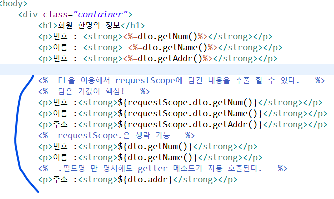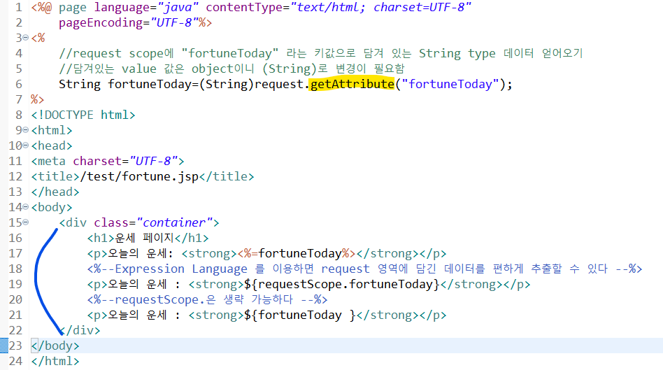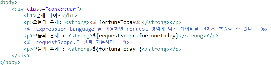 Scope는 request 혹은 session에 데이터를 담아서 jsp에 전달해서 작업을 위임하는 과정