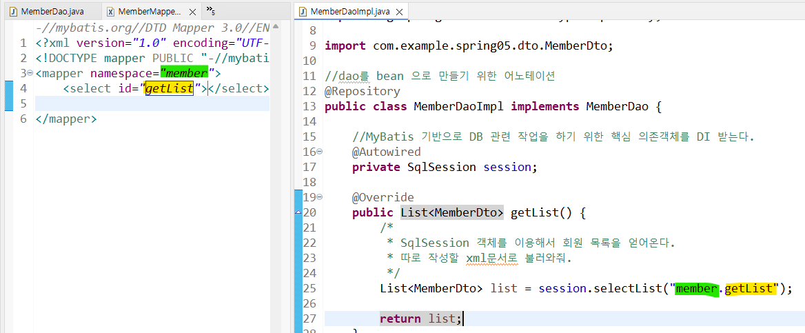 member 은 특정xml을 찾아가는 것이고 getList는 특정 sql문으로 찾아가는 것이다.