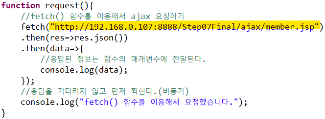 응답을 받아오는 시간동안 console.log("fetch~") 코드 먼저 실행 후 응답을 받아옴.