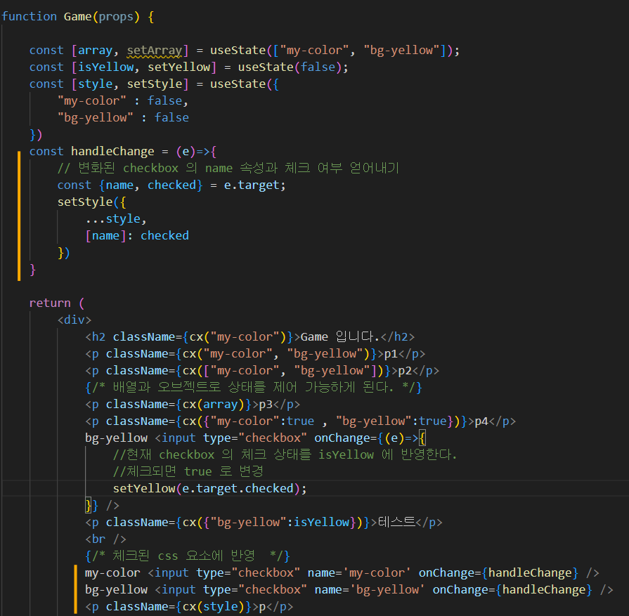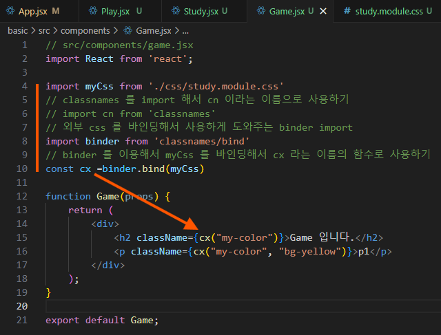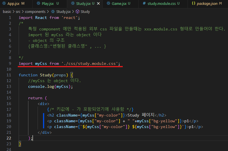 {myCss["my-color"]} 로 {import 한 object 명[" class 이름"]}