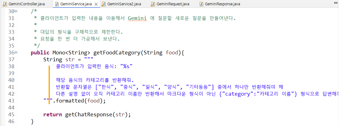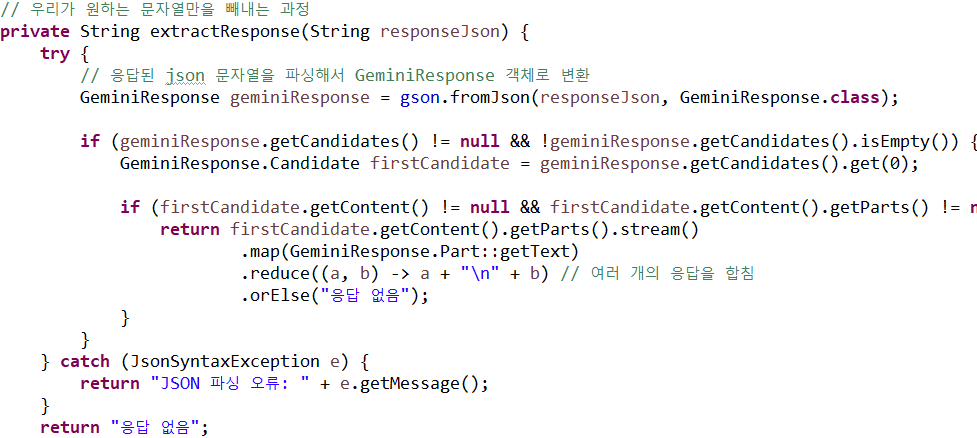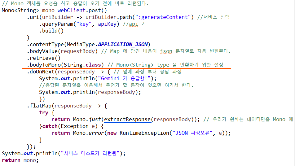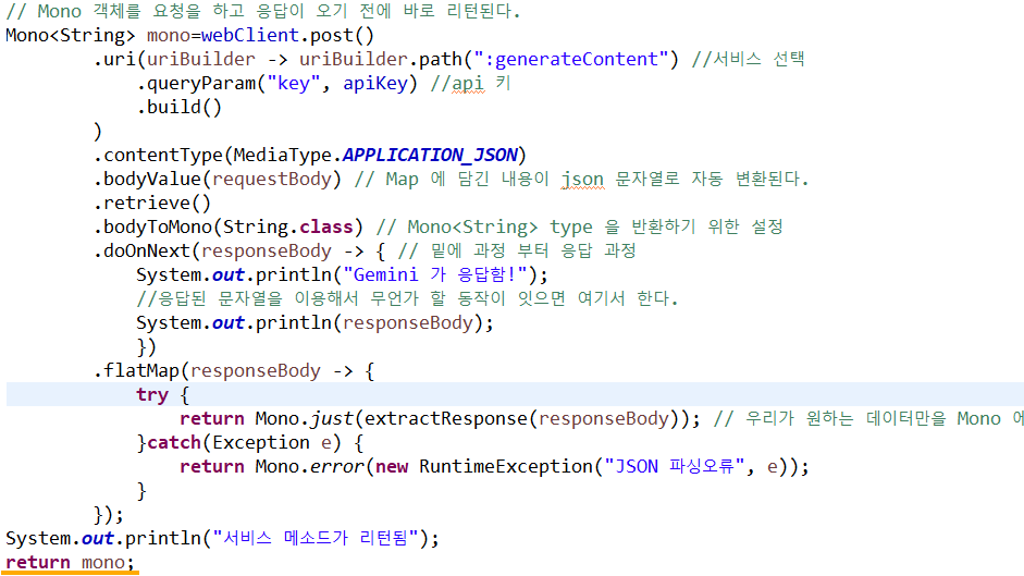 결국 GeminiService 는 원하는 응답데이터가 담긴 Mono를 리턴함