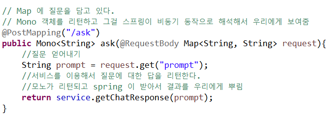 컨트롤러 prompt 에 질문이 담기고 서비스의 응답받는 객체(getChatResponse)로 흐름이 넘어간다.