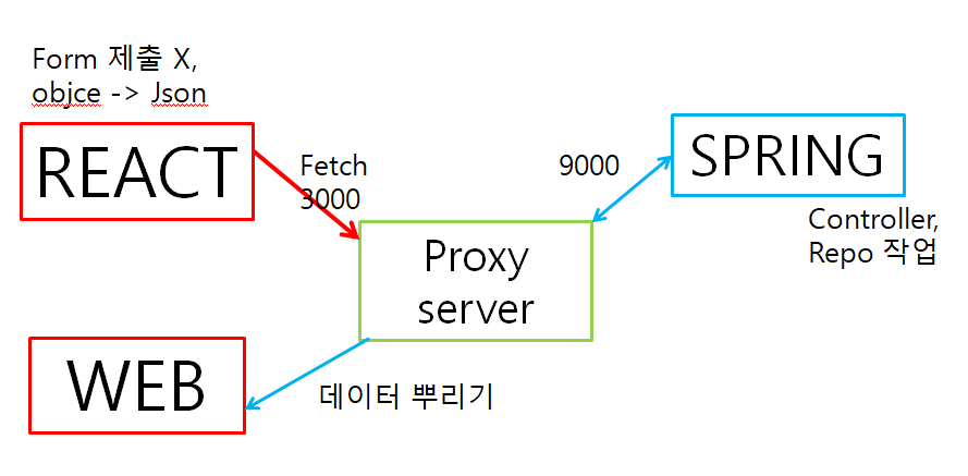 폼 전송은 node 에 하고 porxy Server 가 중개 역할을 하여 Spring 에 전달