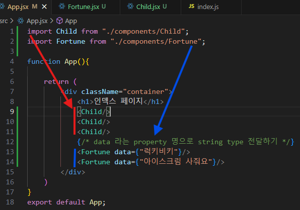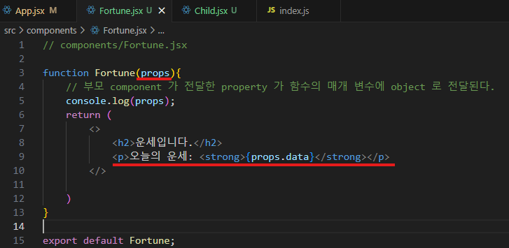 부모 요소에서 데이터를 주면 매개변수(odject)로 받아오고 찐 데이터는 data 라는 방에 존재한다.