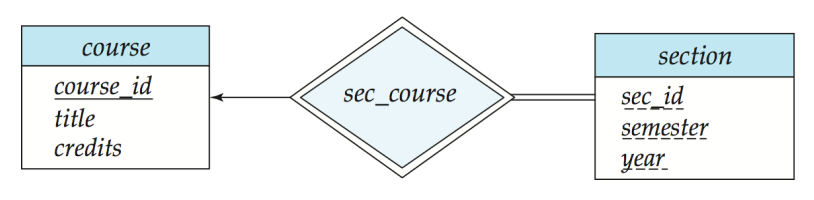 그 둘이 참여한 relationship을 identifying relationship이라고 하고 두 줄 마름모로 표시함 (위 그림 참고)