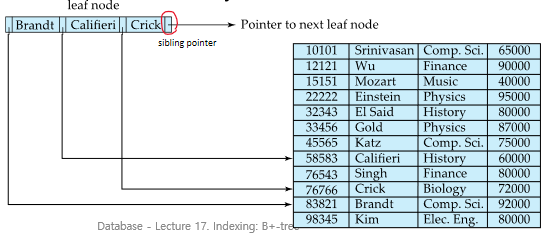 leaf node의 entry는 pointer가 아닌 record를 저장