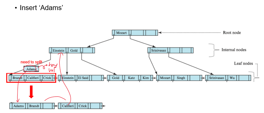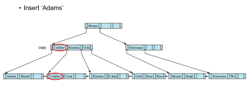 parent node에 새로 생성된 node의 최소 key를 복사하여 삽입, 해당 node를 가리키는 pointer를 삽입