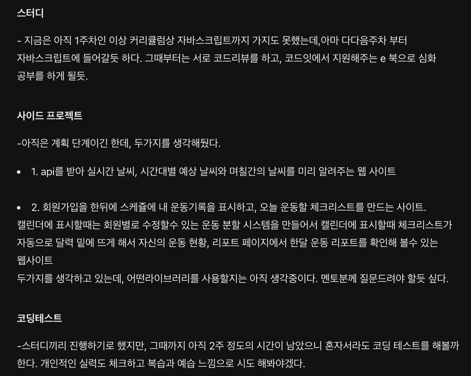 -아직 계획 단계이다. 사실 프로젝트가 처음이여서 손을 대기가 쉽지가 않다. 같은 프로젝트를 여러 라이브러리와 프레임 워크로 작성해보고싶었는데, 이부분이 무지의 단계와 겹쳐서 어렵다... 뭘 모르는지를 모르겠어서 계획을 못새우는중.. 그래서 첫 프로젝트를 해본적도 없는내가 너무 어려운 목표(다양한 프레임워크와 라이브러리를 사용) 한건 아닐까 싶어서 심플한 사이트를 만들어볼까 한다. 다음 회고록 때는 많이 진행되어있길 나 스스로에게 꼭 약속한다!!!