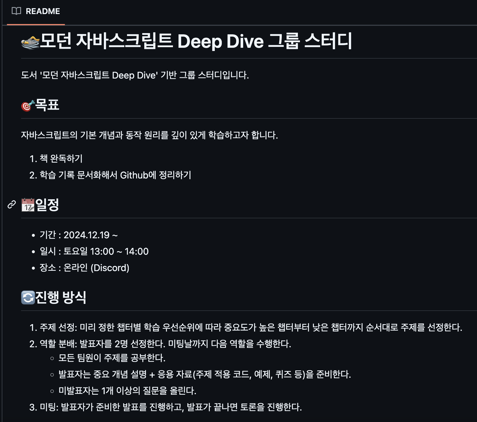 내일이 스터디 첫째날인데, 일단 우리는 자바스크립트 딥 다이브 라는 책으로 발표자를 선정, 매주 스터디 시간에 발표와 질문, 토론등을 진행하기로 했다.