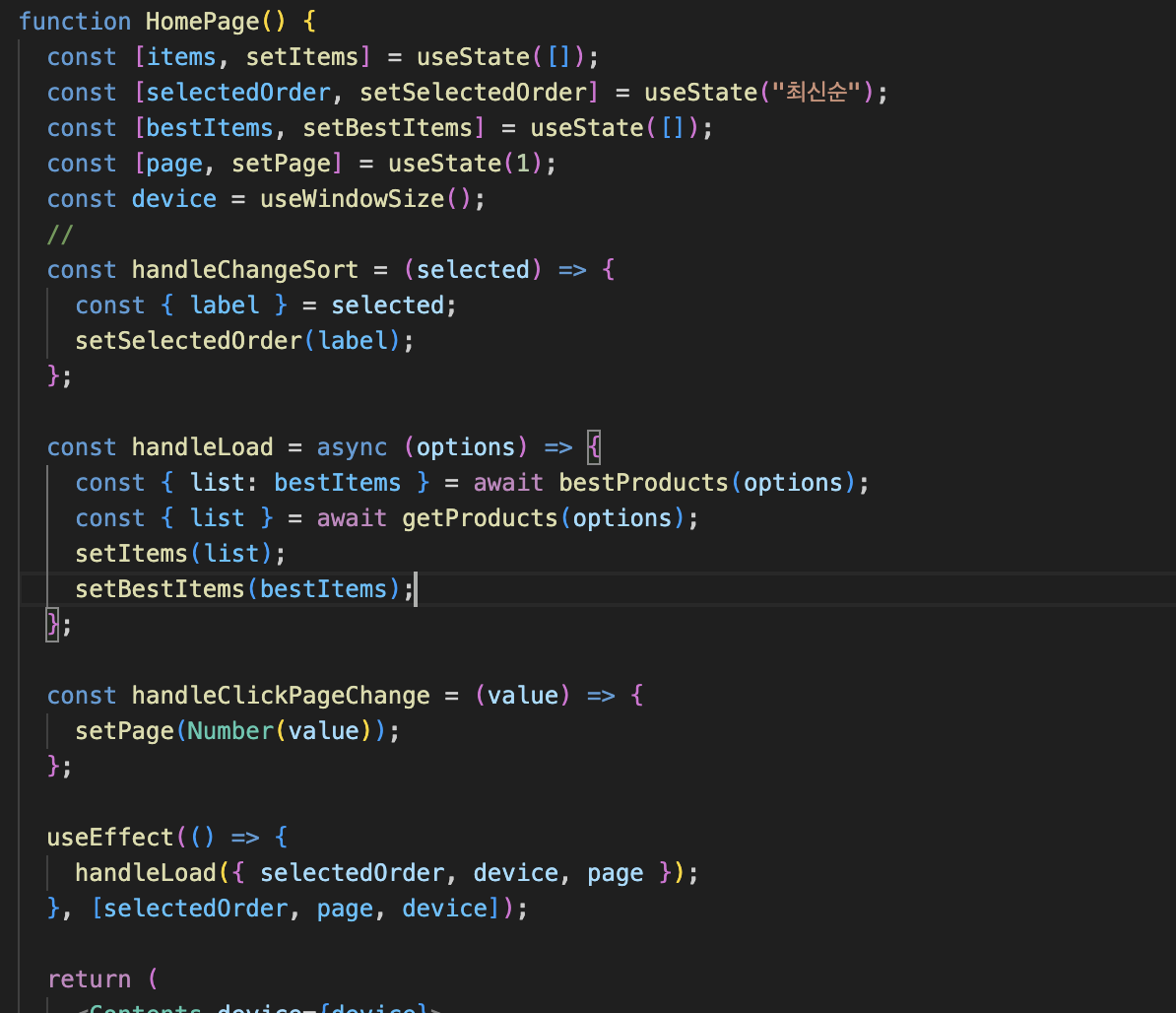 homepage컴포넌트에서는 device값에 따라 useEffect가 작동하고, 그 useEffect에서는 page, order등이 바뀌어 또 다른 useEffect를 작동하므로 너무 많은 재렌더링이 일어나기 때문인것 같았다.