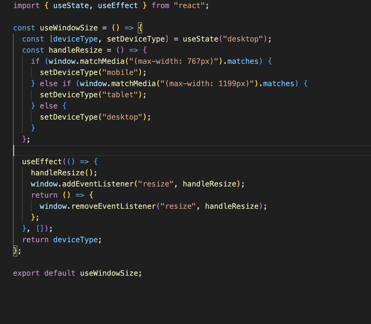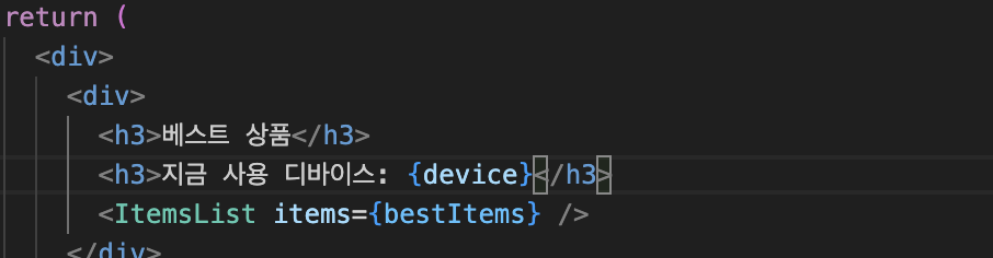 그래서 위와같이 useWindowSize라는 훅으로 사이즈에 따라 mobile, desktop, tablet이라는 값을 할당하고, 리턴해주었다. 그리고 그걸 해당 컴포넌트에서 device라는 값으로 담아주었다.