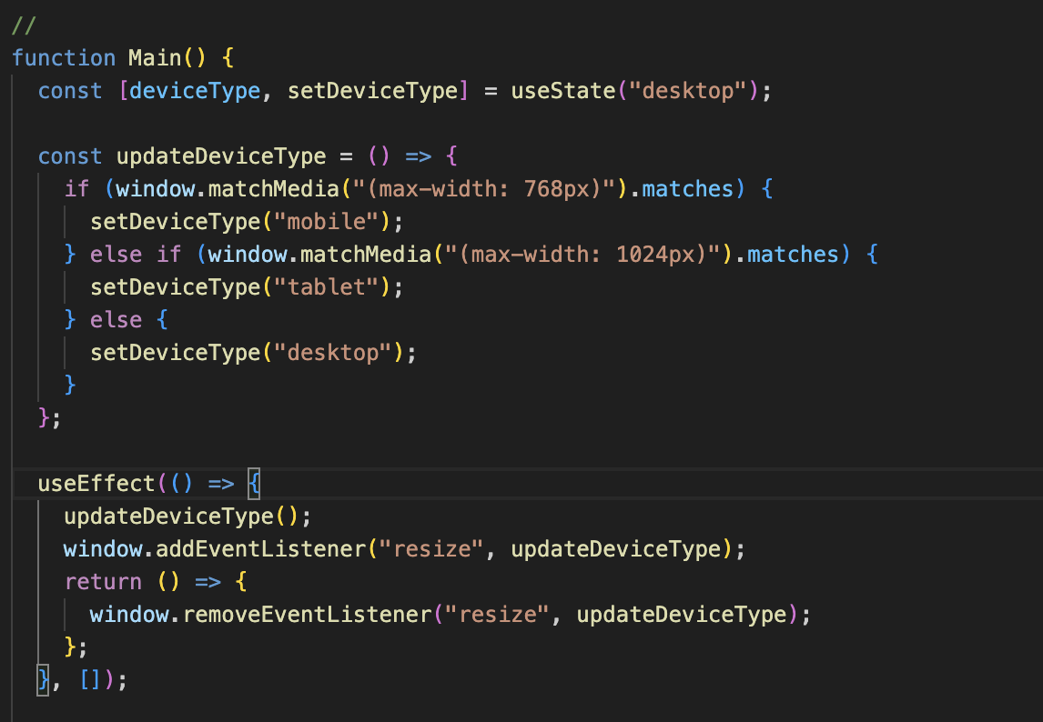 deviceType 값을 자식 컴포넌트에 내려주면, 각 컴포넌트는 추가적인 디바이스 감지 로직 없이 그 값만을 가지고 사용할수 있을것 같았다.