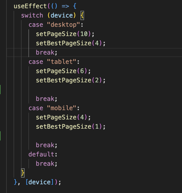 위의 코드를 보면 device가 바뀔때마다 pagesize와 bestPageSize가 바뀌고, 그로인해 또다른 useEffect가 일어났다. 콘솔에 device값을 확인해보니 사이즈가 바뀔때마다 device가 3,4번씩 출력되었다.