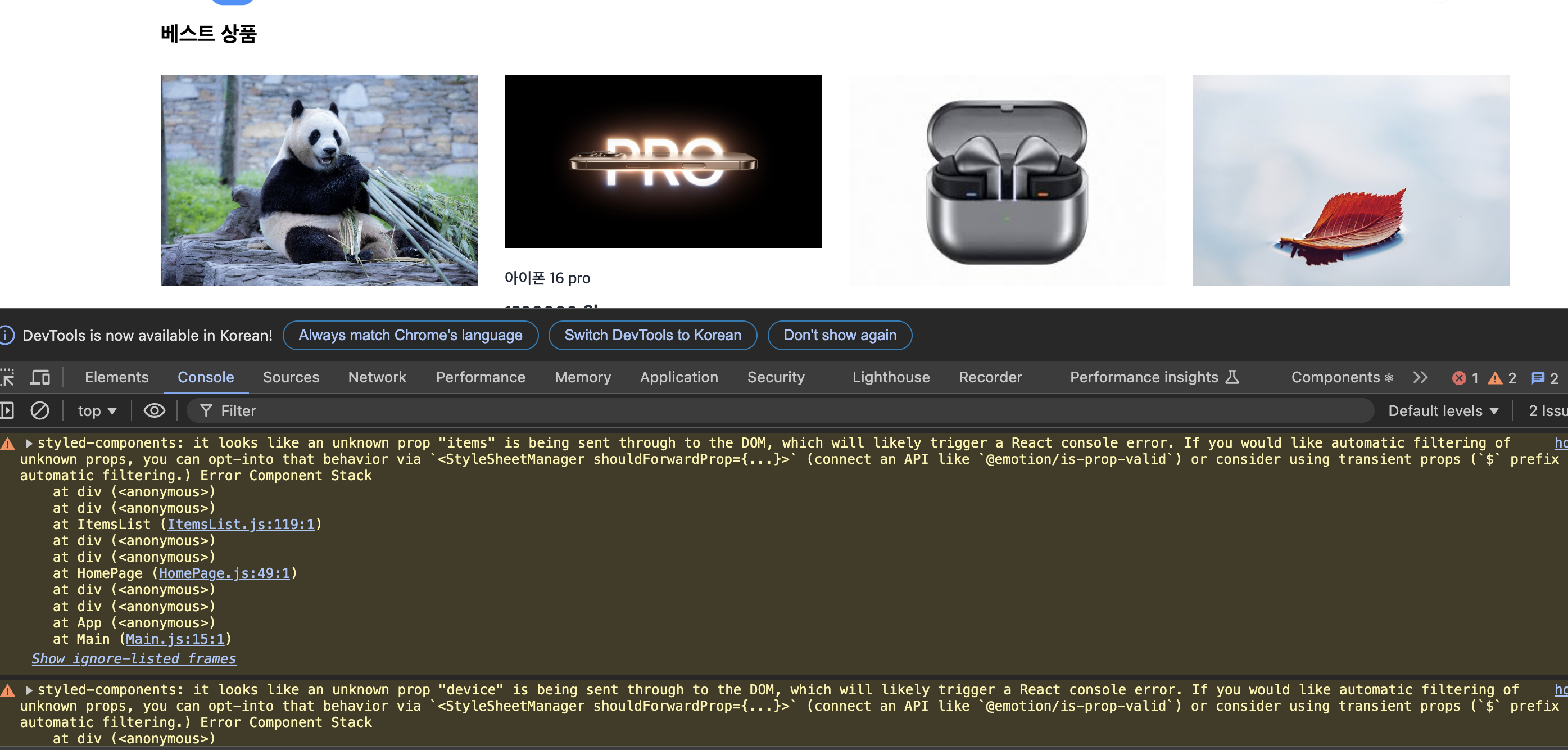 그러나 이미지 태그의 경우 표준 속성이 아닌 내가 지정한 prop을 전달하려 하니 에러가 발생했다.