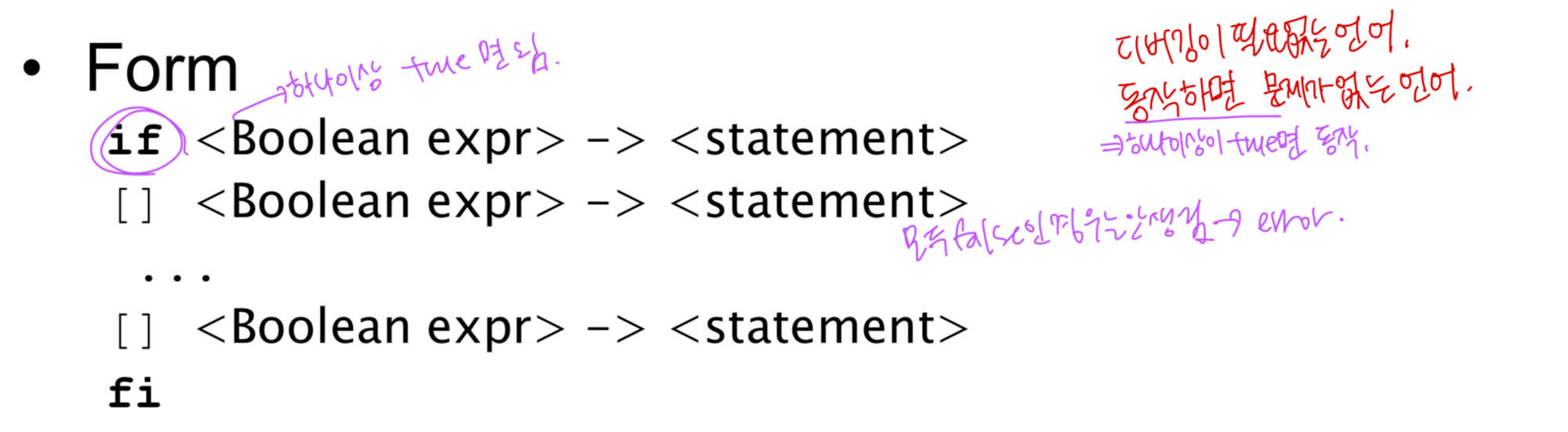 | control expression 의 form과 type | expression while(1) 됨 → arithmetic 일반수식 | boolean expressionwhile(1) 안됨, while(true)여야함 | arithmetic 일반 수식 허용 |