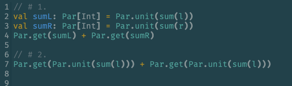 위의 코드처럼 Par.unit 을 통해 병렬 계산을 정의하고, Par.get 을 통해 병렬 계산 결과를 얻는식으로 라이브러리를 설계해볼 수 있다. Par.unit 이 호출된 시점에서 병렬 계산이 바로 시작되고, get 에서는 그 계산된 결과를 얻도록 설계한다면, Par.get(sumL) + Par.get(sumR) 표현식의 참조 투명성이 깨지는 것을 확인할 수 있다.