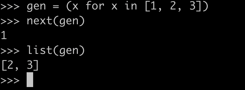 next 는 generater 를 인수로 받는 연산으로, generator 에서 나오는 다음값을 반환한다. 특정한 자료를 소비하는 generator 를 정의하고, next 연산을 수행하면, 해당 원소는 자료에서 소모된다.
