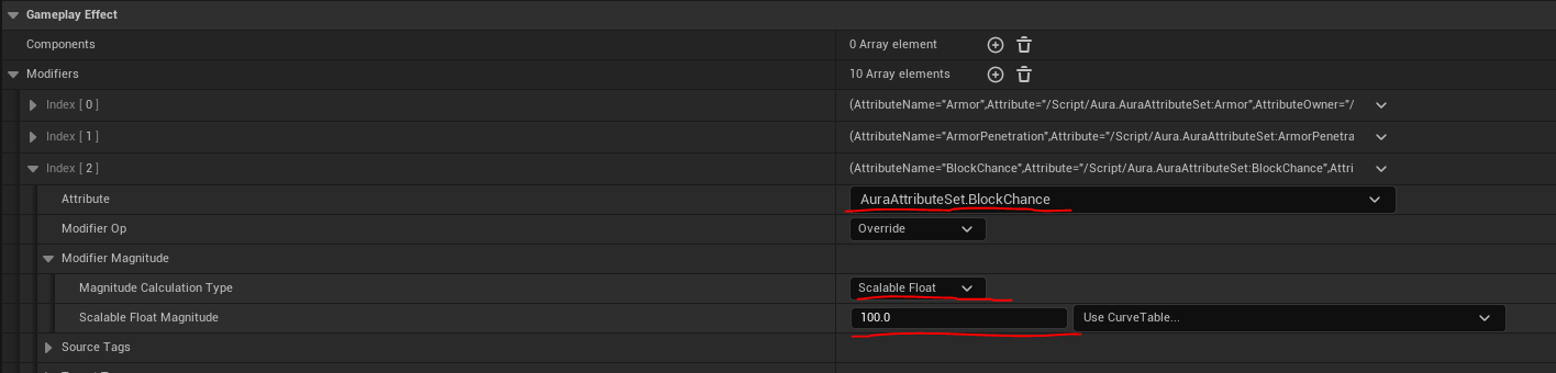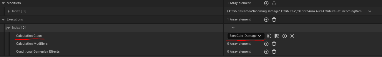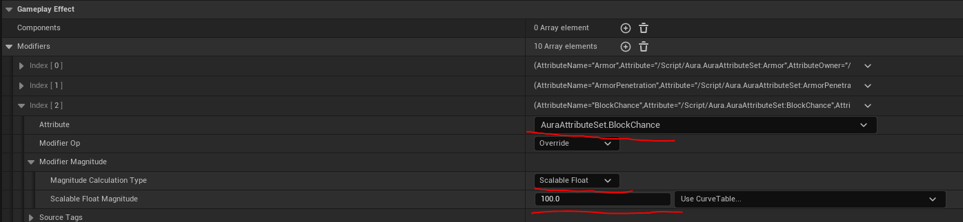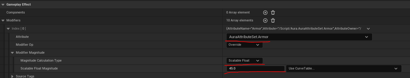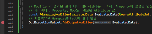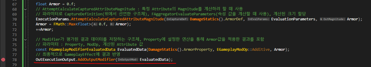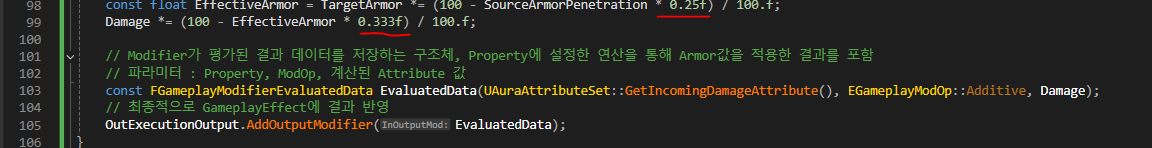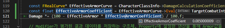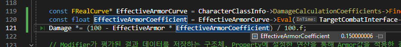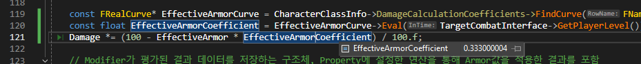 // 필요한 헤더파일 확인되면 작성 #include "..." ... void UExecCalc_Damage::Execute_Implementation(const FGameplayEffectCustomExecutionParameters& ExecutionParams, FGameplayEffectCustomExecutionOutput& OutExecutionOutput) const { ... /** 코드 수정 : const 삭제 */ AActor* SourceAvatar = SourceASC ? SourceASC->GetAvatarActor() : nullptr; AActor* TargetAvatar = TargetASC ? TargetASC->GetAvatarActor() : nullptr; /** 코드 수정 */ /** 코드 추가 */ // CombatInterface에 있는 레벨 리턴 함수 사용을 위함 ICombatInterface* SourceCombatInterface = Cast<ICombatInterface>(SourceAvatar); ICombatInterface* TargetCombatInterface = Cast<ICombatInterface>(TargetAvatar); /** 코드 추가 */ ... SourceArmorPenetration = FMath::Max<float>(SourceArmorPenetration, 0.f); /** 코드 추가 */ // GameMode 직접 캐스팅하여 사용 const AAuraGameModeBase* AuraGameMode = Cast<AAuraGameModeBase>(UGameplayStatics::GetGameMode(SourceAvatar)); if (AuraGameMode == nullptr) return; // AuraGameMode->CharacterClassInfo; /* chap.10.3.5 커브테이블 생성 및 적용 이후 오류 생겨서 임시로 직접 캐스팅후 진행, 해결방법 확인되면 수정 */ const UCharacterClassInfo* CharacterClassInfo = AuraGameMode- >CharacterClassInfo; const FRealCurve* ArmorPenetrationCurve = CharacterClassInfo->DamageCalculationCoefficients->FindCurve(FName("ArmorPenetration"), FString()); const float ArmorPenetrationCoefficient = ArmorPenetrationCurve->Eval(SourceCombatInterface->GetPlayerLevel()); /** 코드 추가 */ /** 코드 수정 : 0.25f -> ArmorPenetrationCoefficient */ const float EffectiveArmor = TargetArmor * (100 - SourceArmorPenetration * ArmorPenetrationCoefficient) / 100.f; /** 코드 수정 */ /** 코드 추가 */ const FRealCurve* EffectiveArmorCurve = CharacterClassInfo->DamageCalculationCoefficients->FindCurve(FName("EffectiveArmor"), FString()); const float EffectiveArmorCoefficient = EffectiveArmorCurve->Eval(TargetCombatInterface->GetPlayerLevel()); /** 코드 추가 */ /** 코드 수정 : 0.333f -> EffectiveArmorCoefficients */ Damage *= (100 - EffectiveArmor * EffectiveArmorCoefficient) / 100.f; /** 코드 수정 */ }