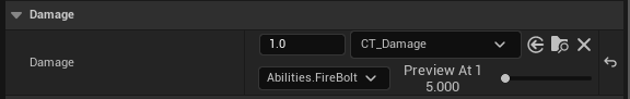GA_FireBolt 에서 데미지의 계수를 1로 지정해주고, Curve Table : CT_Damage 로 설정해준 다음, Select Curve : Abilities.FireBolt 로 설정한다.