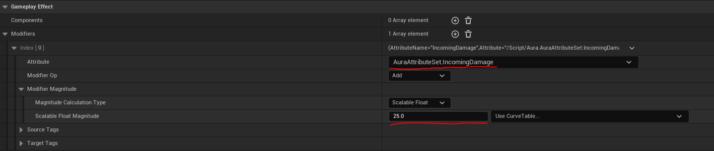 컴파일 후 GE_Damage 에서 Attribute : AuraAttributeSet.IncomingDamage 로 수정하고, Scalable Float Magnitude : 25 (함수 내에서 자체적으로 마이너스 계산을 하기 때문)로 변경한다.