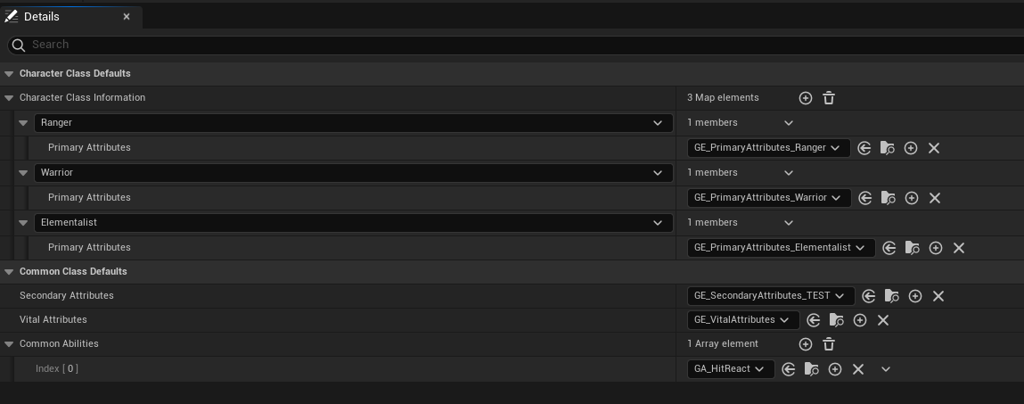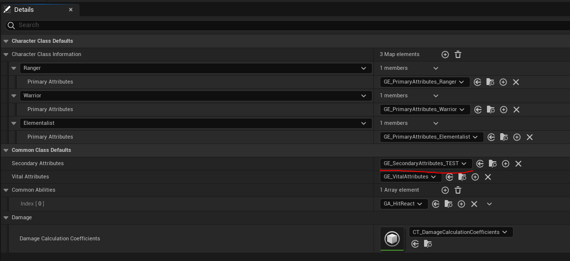 DA_CharacterClassInfo 에서 GE_SecondaryAttributes_TEST 를 사용하는지 확인하고