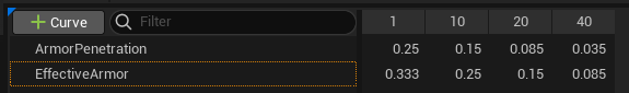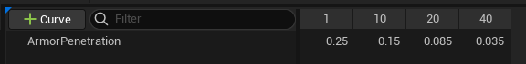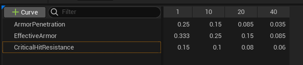 컴파일 후 CT_DamageCalculationCoefficients 에서 CriticalHitResistance 커브를 추가하고 아래 테이블을 따라 수치를 입력한다.