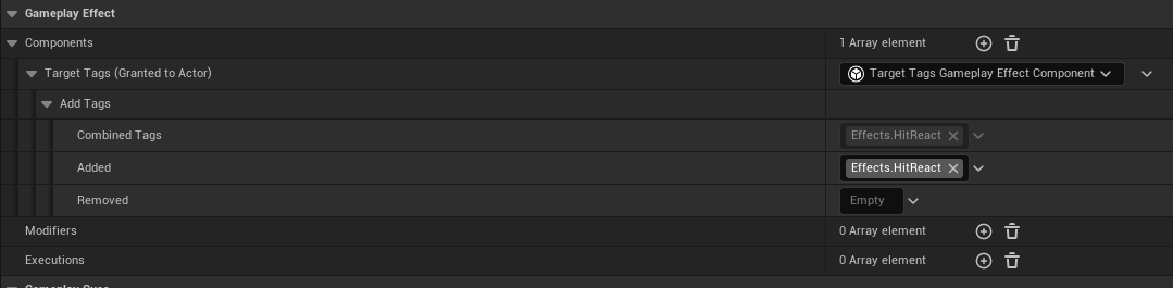 GE_HitReact 로 돌아와서 Gameplay Effect -> Components 옆의 + 클릭 -> Target Tags Gameplay Effect Component -> Add Tags -> Add : Effects.HitReact 로 설정해준다.