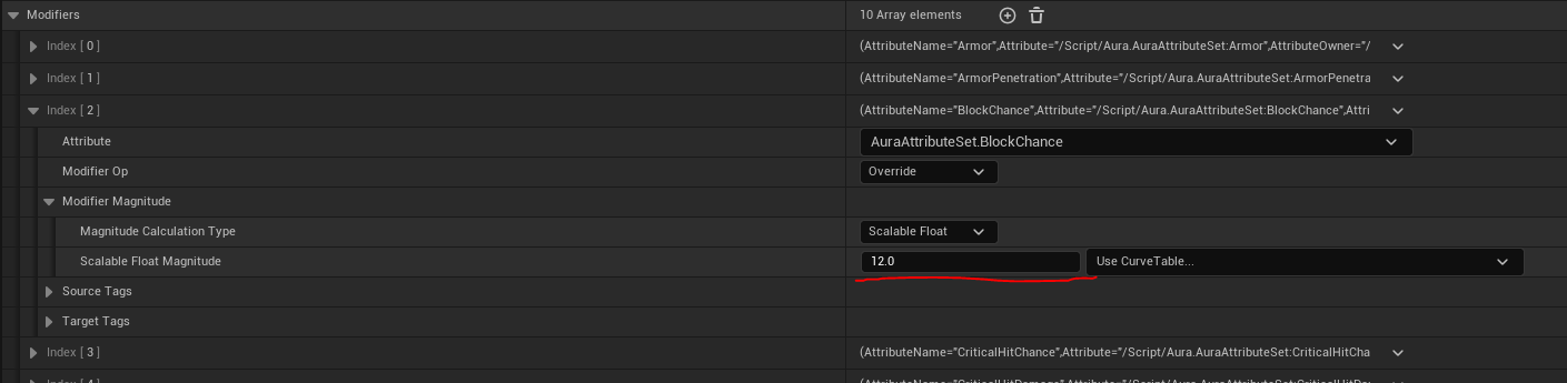 DA_CharacterClassInfo 를 열고 DamageCalculationCoefficients : CT_DamageCalculationCoefficients 로 설정한다.
