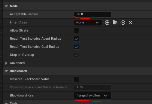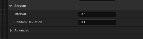 BTS_FindNearestPlayer 를 살펴보면 특정 액션을 기본으로 0.5초의 Interval 을 두고 0.1초의 Random Deviation 차를 두고 실행하도록 되어 있는 것을 확인할 수 있다.