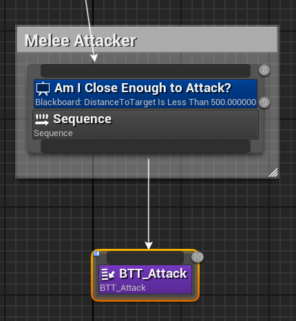BTT_Attack 에서 Combat Target Selector 노드에서 키의 밸류를 얻기 위해 Get Blackboard Value as Actor 와 연결시키고, 값의 유효성을 검사한 다음 Try Activate Abilities by Tag 노드와 연결한다.