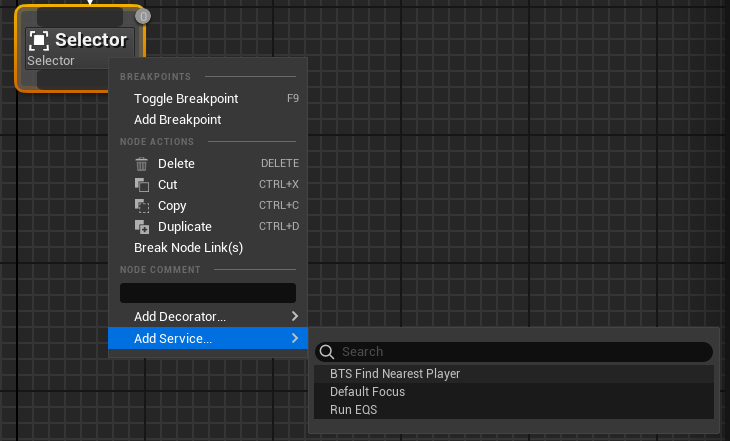 Service 는 Selector와 함께 작동하여 특정 역할을 수행하게 된다. Service는 주기적으로 또는 조건이 충족될 때마다 Behavior Tree의 상태를 검사하고 업데이트하는 노드Service 를 Selector 에 부착시켜 동작시키는 방법도 있지만, 직접 고유의 Service 를 생성하는 것도 가능하다.