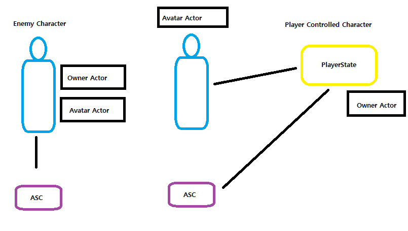 Ability System Component 를 실제로 소유하는 클래스Ability System Component 와 관련된 월드에서의 표현(번역이 다소 매끄럽지 않음)