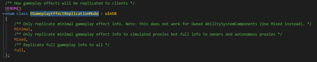 EGamePlayEffectReplicationMode 를 살펴보면 어떻게 GameplayEffect를 클라이언트에게 리플리케이트되는지에 대한 설정이라고 설명한다.