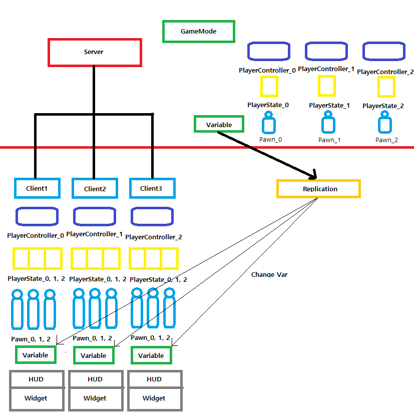 GameMode 와 각 플레이어의 PlayerController , PlayerState , Pawn , Variable 에 대한 정보를 가지고 있다.PlayerController , Variable , HUD , Widget 을 가지고 있고 게임 플레이에 필요한 타 플레이어의 PlayerState , Pawn 에 대한 정보를 가지고 잇다.RPC(Remote Procedure Call) 를 이용한다.