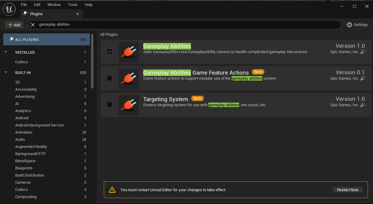 먼저 Gameplay Abilities 플러그인을 추가해주어야 한다.