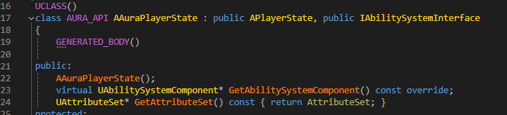 기존에 PlayerState 클래스가 public IAbilitySystemInterface 로부터 파생되도록 코드를 작성하였고, virtual UAbilitySystemComponent* GetAbilitySystemComponent() const override; 를 통해 ASC에 접근하도록 구현하였다.